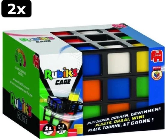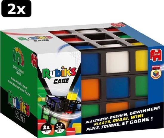 Draaien, Wenden, Keren en Winnen! Rubik’s Cage is voor 2-4 spelers. De speler die als eerste aan een zijde van de Rubik’s Cage 3 cubies van dezelfde kleur op een rij heeft – verticaal, horizontaal of diagonaal – is de winnaar!