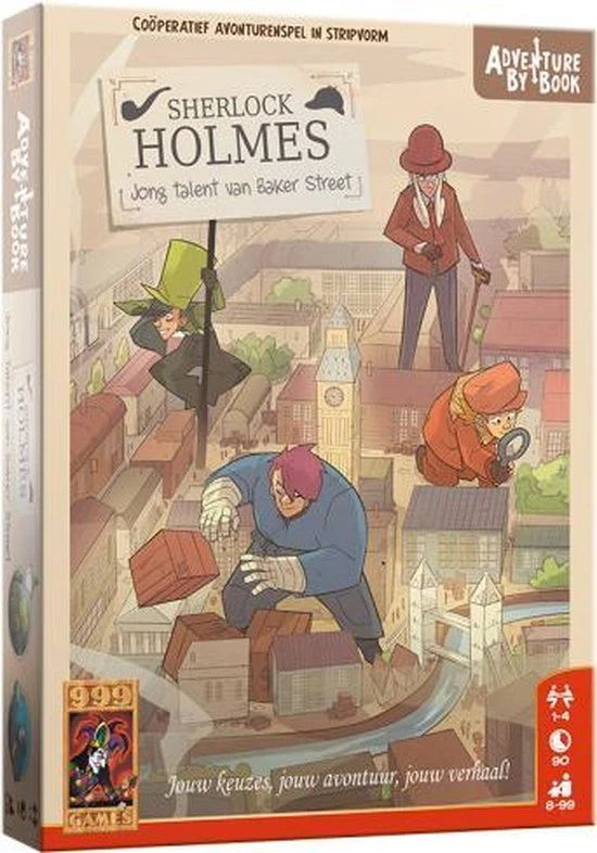 In de Adventure by Book-serie bepalen jouw keuzes hoe het verhaal zich voortzet. Elk stripboek is een eigen verhaal op zich. In de plaatjes zijn cijfers verstopt die de opties weergeven die jouw personage kan nemen. Onderweg zul je puzzels oplossen, voorwerpen verzamelen en gevaren ontwijken om het best mogelijke verhaal te vertellen. Hierbij zijn er meerdere routes beschikbaar voordat je het einddoel behaalt. Na 1x spelen ben je dus nog lang niet klaar. En bovendien zul je wanneer je de verkeerde keuzes maakt, verliezen en opnieuw moeten beginnen. Net als in elk ander spel. In Sherlock Holmes: Jong talent van Baker Street kun je voor het eerst zien waar het allemaal begon. De verhaallijn vindt plaats na de beroemde duik bij de Reichenbach-watervallen, waar Sherlock en Moriarty naar verluidt zijn gestorven. Nu kun je zien wat er daarna is gebeurd en hoe Sherlock terugkwam in het zadel. Sherlock vertrouwt erop dat jullie je deductieve bekwaamheden bewijzen en zaken oplossen die inspecteur Lestrade en Scotland Yard op zijn zachtst gezegd in de war hebben gebracht. Let goed op. Het zijn schimmige zaken die jullie onderzoeken en Sherlock zal geen mislukkingen tolereren. Volg het spoor, verhoor verdachten, en zoek naar aanwijzingen om de zaak op te lossen. Denken jullie de daders te slim af te kunnen zijn? Hoe je de mysteries ook oplost, het is jullie keuze, jullie verhaal, jullie avontuur. psstt: De code voor de geheime missie is: 1941. Is het jou gelukt deze code te kraken door goed te kijken naar de rioolputten? Sherlock Holmes is trots op jullie!