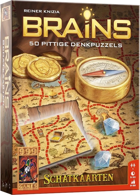 Met Brains: Schatkaarten kun je je vastbijten in 50 nieuwe puzzels in de Brains-serie. Alle puzzels bestaan uit een puzzelkaart met aanwijzingen voor de acht schatkaarttegels die hierop moeten worden geplaatst. Elke puzzelkaart heeft maar ??n oplossing. De puzzels zijn verdeeld in vijf verschillende niveaus, van makkelijke opwarmertjes tot extreem moeilijke uitdagingen. Brains: Schatkaarten is verslavend! De puzzels zijn met slechts acht tegels makkelijk op te zetten, waardoor je snel aan de slag kunt. Mocht je er echt niet uitkomen, dan biedt een bijgeleverd boekje met hints en oplossingen uitkomst. Hoe snel kun jij alle schatkaarten vinden?