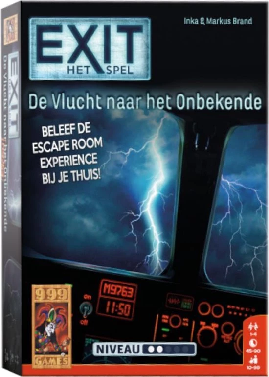 Als deel van de bemanning van een passagiersvliegtuig slaat de schrik je om het hart als jullie worden overvallen door noodweer. De wind schud het vliegtuig heen en weer, water stroomt naar binnen en alle systemen beginnen te falen. Het wordt een race tegen de klok om het vliegtuig op tijd weer aan de praat te krijgen. Probeer binnen anderhalf uur alle puzzels op te lossen en alle codes te breken. Alleen dan lukt het jullie om de storm te overleven en het vliegtuig weer veilig te laten landen. Logisch nadenken en doorzettingsvermogen zijn vereist om dit spel tot een goed einde te brengen. En komen jullie er echt niet uit, dan bevat het spel tipkaarten om jullie op het goede spoor te brengen. EXIT: De vlucht naar het onbekende is maar één keer speelbaar omdat het speelmateriaal moet worden beschreven, gevouwen of afgescheurd. Maar net als in een “echte” escape room garanderen we een unieke puzzel- en speelervaring! De vlucht naar het onbekende heeft een niet te al te hoge moeilijkheidsgraad en is dus uitermate geschikt voor beginners en ontspannen puzzelaars.