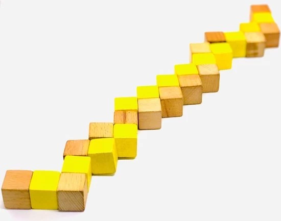 Houten kubussen zijn met rubber aan elkaar verbonden door speciaal diagonaal of recht doorgeprikt.