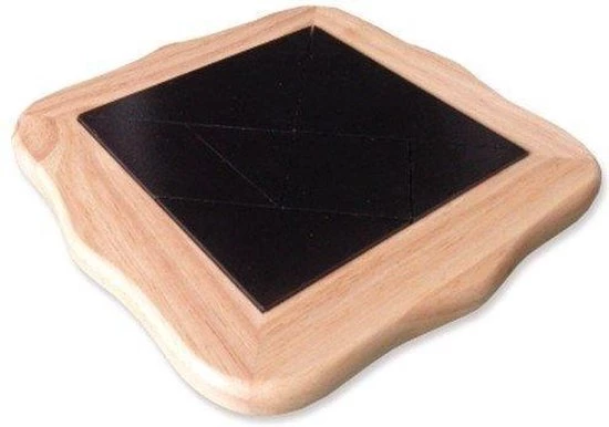 Tangram groot massief hout met gewelfde blank houten rand, met 7 massieve zwart gelakte houten stenen. Spel maat stenen 22 x 22 x 1.8 cm. Inclusief Tangram boekje met historie en 208 opgaven en oplossingen.