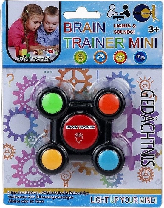 Test je geheugen met dit leuke Brain Trainer geheugenspel. Het spel is met licht en geluid en helpt je bij het concenteren en het trainen van je geheugen. Dit spel is geschikt voor jong en oud. Het wordt gespeeld door verschillende combinaties van lichten na te bootsen. De combinaties komen in 30 moeilijkheidsgraden. Druk op de knop en het spel zal beginnen met een vlakje dat oplicht. Dat vlakje druk je vervolgens in. Daarna zullen 2 vlakjes na elkaar oplichten, die je ook indrukt. Zo krijg je steeds meer vlakjes op de route die oplichten, die je moet onthouden, waardoor het steeds moeilijker wordt. Dit spel heeft 5 kleurrijke knoppen en is van kunststof gemaakt. Verder ontvang je 3 batterijen in de verpakking.