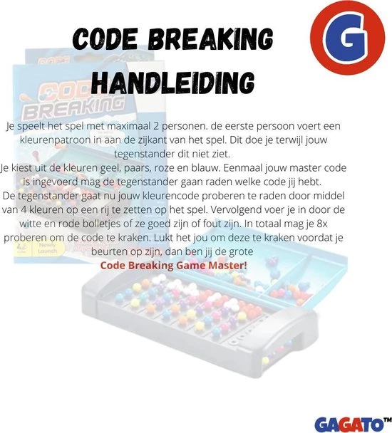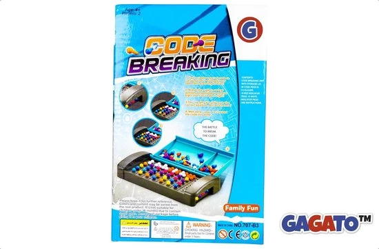 In Code Breaking probeer je de code van de ander te ontcijferen door telkens een reeks kleuren op het spelbord te leggen. De ander mag alleen maar aangeven welke kleuren kloppen. Zo kom je met elke reeks een stukje dichter bij de oplossing. Ben jij klaar voor de ultieme krachtmeting van tactiek, inzicht & logica?