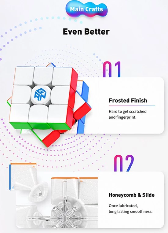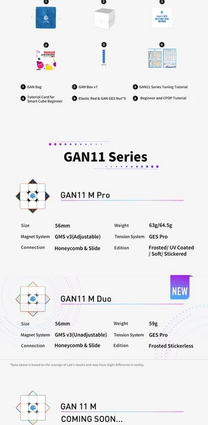 De GAN 11 M Duo 3×3 is een nieuwe, meer betaalbare variant van de populaire GAN 11 M Pro. De Duo is in alle opzichten identiek aan de Pro, behalve dat de Duo geen verstelbare magneten heeft. Het resultaat is een ultralichte kubus van 60 gr, alleen goedkoper.