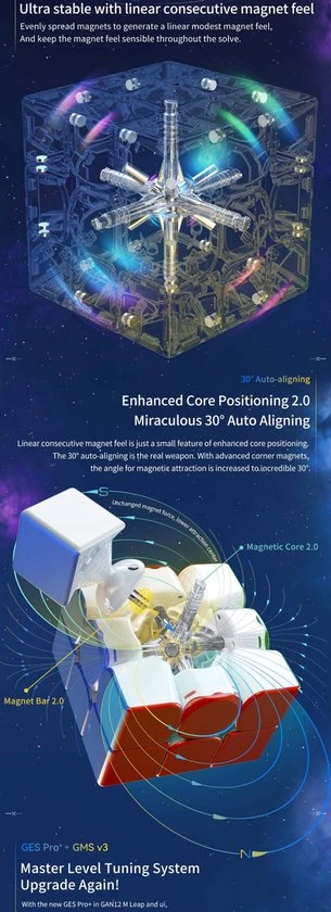 De GAN 12 MagLev (frosted en Uv) 3×3 staat op het moment het toppunt van 3×3 innovatie en design. Deze kubus bevat verstelbare magneten in de stukjes en een instelbaar magnetisch levitatie-spannings- / compressiesysteem. Deze technologie maakt gebruik van tegengestelde magneten om het gevoel van een veer te imiteren en tegelijkertijd wrijving en veergeluid te verminderen. Deze Uv versie heeft een glanzende (glossy) afwerking aan de buitenkant.