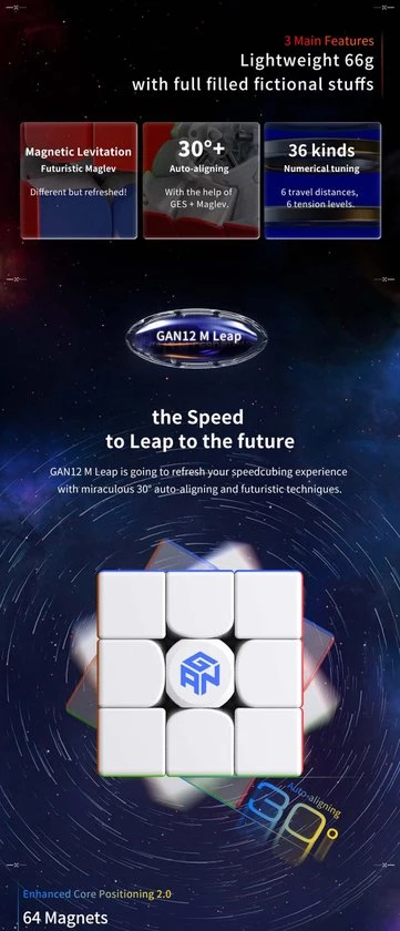 De GAN 12 m Leap 3×3 is de nieuwste 3×3 van GAN. Deze versie bevat verstelbare magneten in de stukjes en een instelbaar veerdruk-/spanningssysteem. De 12 M Leap heeft een matte buitenafwerking met heldere stickerloze kleuren.