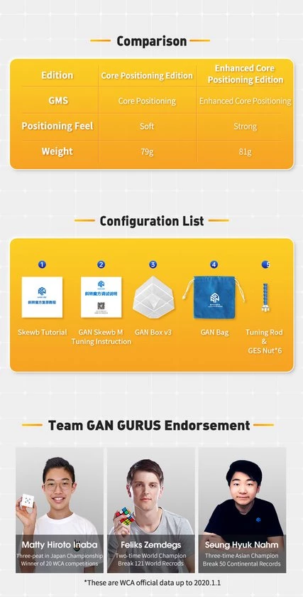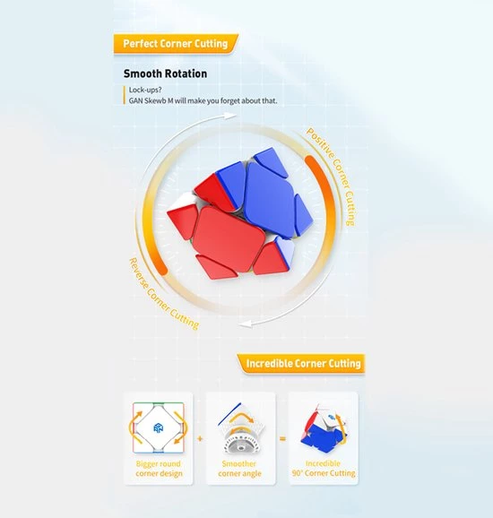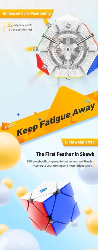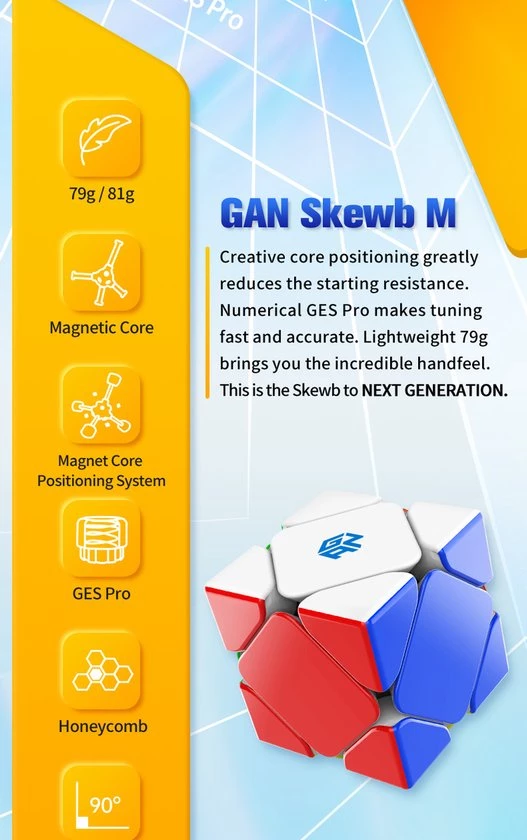 De GAN Skewb heeft een enorme vooruitgang in het Skewb-mechanisme. Deze Skewb heeft veel van de innovatieve functies van GAN die hen op de kaart hebben gezet. Zoals hun GES-spansysteem en het nieuwe Core / Corner Magnet-systeem dat onlangs is geïntroduceerd! De GAN Skewb is voorzien van een verbeterd magnetisch positioneringssysteem.