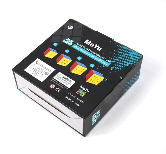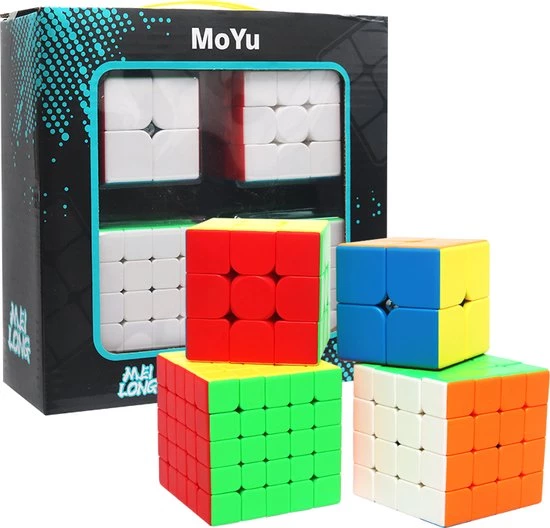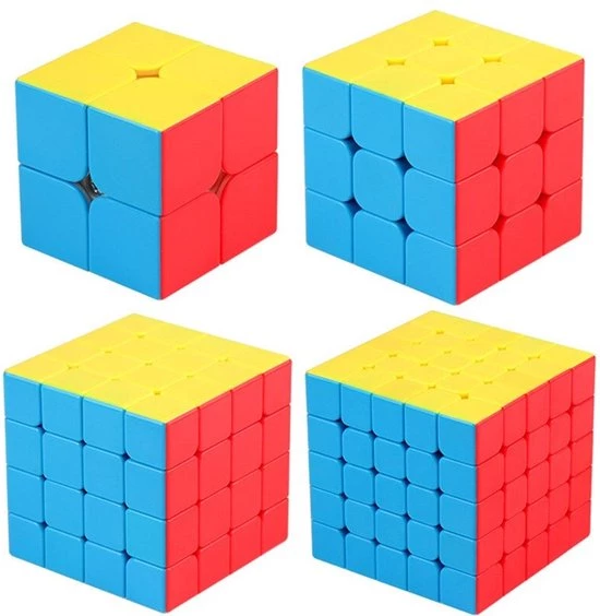 In de verpakking: 2×2 Rubiks cube, 3×3 Rubiks cube, 4×4 Rubiks cube, 5×5 Rubiks cube + 1x Handleiding
