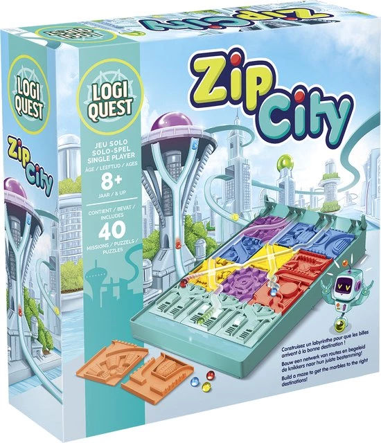 Jij moet ervoor zorgen dat alle Zippysferen tijdig hun eindstation bereiken. Rangschik de Spoortegels van de stad, creëer paden, en breng de knikkers in de juiste volgorde naar hun gevraagde bestemming. Met 40 Puzzelkaarten die je creatieve, logische en intuïtieve denkpatronen stimuleren, biedt Zip City oneindig veel speelplezier voor kinderen én volwassenen!