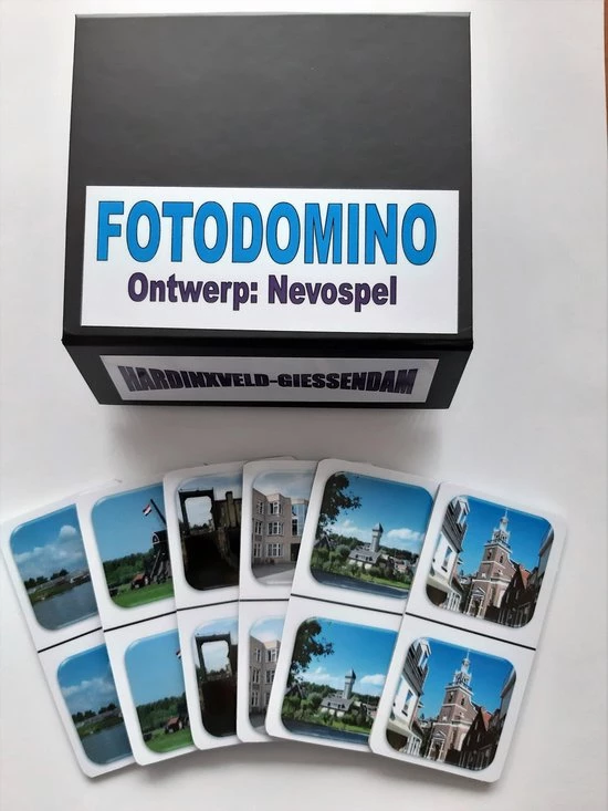 FotoDomino Hardinxveld-Giessendam is speciaal gemaakt voor ouderen en voor mensen met een hersenaandoening zoals bijvoorbeeld dementie. Het spel bestaan uit 28 grote kaarten van 6-12cm, aan beide zijdes voorzien van een lamineerlaag zodat de kaarten afneembaar zijn. Ze zijn ongeveer 3 mm dik, zodat ook gespeeld kan worden met mensen waarbij de fijne motoriek niet meer is wat het zou moeten zijn.