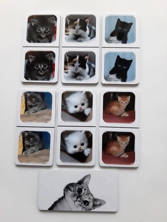FotoDomino Kittens is speciaal gemaakt voor ouderen en voor mensen met een hersenaandoening zoals bijvoorbeeld dementie. Het spel bestaan uit 28 grote kaarten van 6-12cm, aan beide zijdes voorzien van een lamineerlaag zodat de kaarten afneembaar zijn. Ze zijn ongeveer 3 mm dik, zodat ook gespeeld kan worden met mensen waarbij de fijne motoriek niet meer is wat het zou moeten zijn.