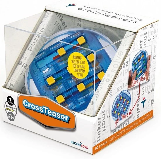 Crossteaser – 3-D Brainpuzzle. De CrossTeaser puzzel bestaat uit draaibare kruizen. Draai een kruis naar ??n van de open ruimtes. Met deze draai verdraaid ook de kleur. Probeer 8 dezelfde kleuren aan beide zijden te krijgen met een ruimte in het midden. De CrossTeaser is verpakt in blister. Moeilijkheidsgraad: 4 van de 5 sterren. Recent Toys