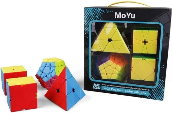 De set bevat 4 compleet verschillende puzzels en staat gegarandeerd voor uren speel plezier. De Pyraminx is het gemakkelijkst op te lossen van de set. De Skewb is door het draaipunt een compleet andere beleving dan de normale 3×3 kubus. De Megaminx is een absoluut monster, deze puzzel heeft 100 undeciljoen mogelijkheden dat is een 1 met 68 nullen! Ondanks dat wordt de Square-1 als moeilijkste WCA puzzel beschouwd.