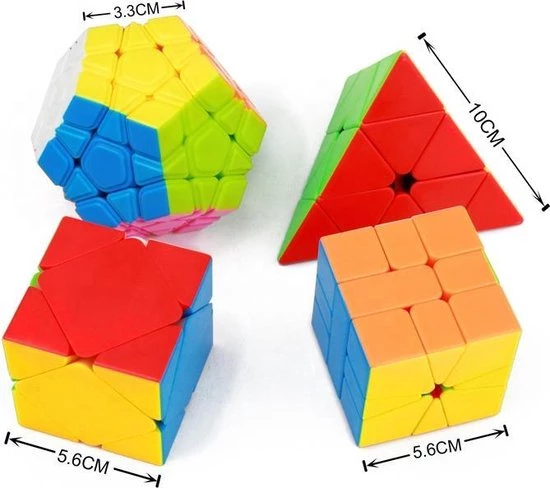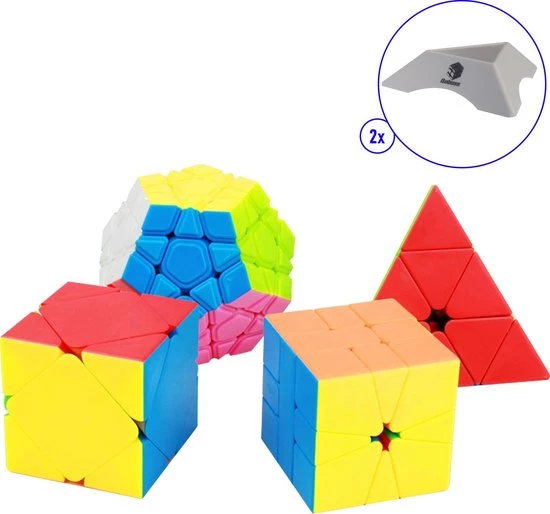 ?In de verpakking: 2x Cubestandaard, 1x Pyraminx, 1x Megaminx, 1x Square-1, 1x Skewb+ 1x Handleiding