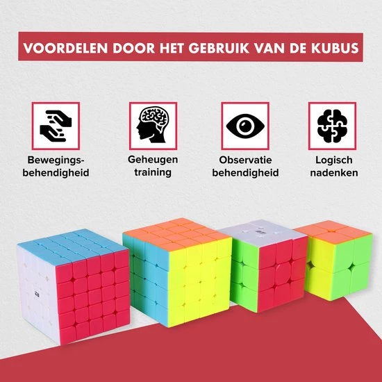 De QY CUBE PLAYSET is een uitdaging voor jong en oud. Naast de originele 3×3 speed cube, ontvang je de hele 4- delige set. Deze set bestaat uit een 2×2, 3×3, 4×4 en 5×5 model. De puzzel kubus bevat een frictieloos design. De kubus draait hierdoor erg makkelijk en dit zal zorgen voor het halen van nieuwe records. De professionele binnenstructuur creëert extra stevigheid, waardoor de kubus fijn in de hand ligt. Maak gebruik van het Nederlandstalig en/of Engelstalig e-book voor handige tips en tricks. Dit maakt het oplossen van de QY CUBE PLAYSET voor iedereen mogelijk!