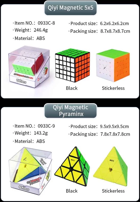 In deze serie vind je de volgende varianten: 2?2, 3?3, 4?4, 5?5 en pyraminx in stickerless en in het zwart.