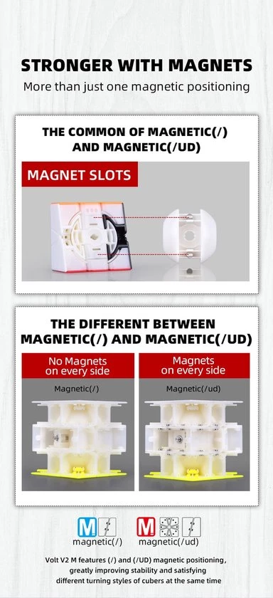 De X-Man Volt Square-1 V2 M (gedeeltelijk magnetisch) is een nieuwe bijgewerkte update van de populaire Volt Square-1. Deze vernieuwde versie heeft een duurzamer robuuster ontwerp, wat ook zorgt voor een betere stabiliteit. Daarbij komt dat er in de middelste laag door de fabriek geïnstalleerde magneten zitten, wat ook meer nauwkeurigheid bij het draaien biedt. Met een duurzamere borgmoer om core stripping te voorkomen.