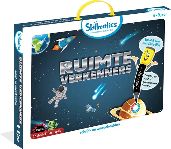 | Verpakkingsinhoud | 20, herhaalbare, opdrachten, 6, dubbelzijdige, matten, 2, duurzame, Skilly, Billy, pennen, 1, veegdoek, 1, Skilly, Billy, diploma |