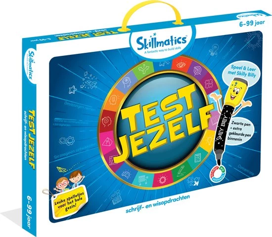 | Verpakkingsinhoud | 13, herhaalbare, opdrachten, 6, dubbelzijdige, matten, 2, duurzame, Skilly, Billy, pennen, 1, veegdoek, 1, Skilly, Billy, diploma |