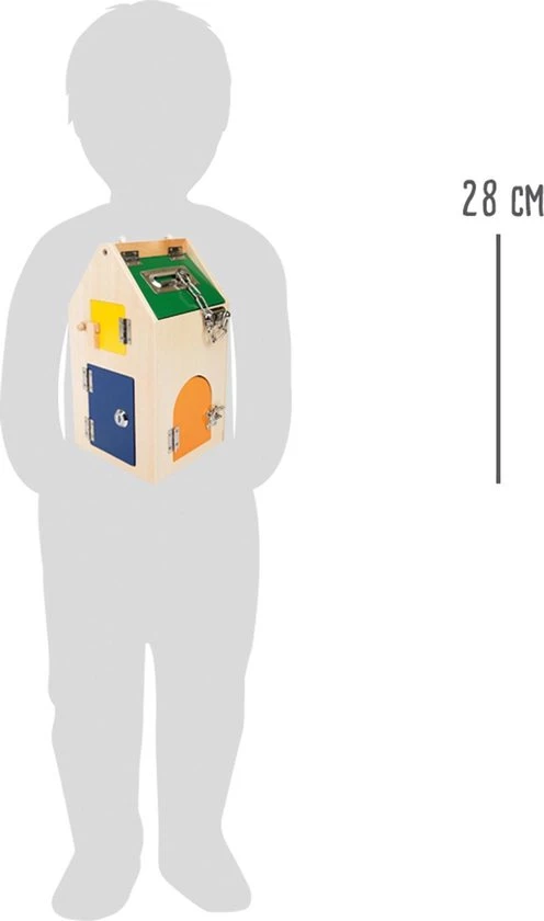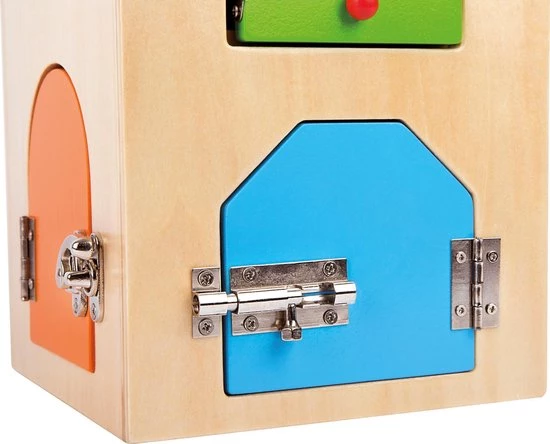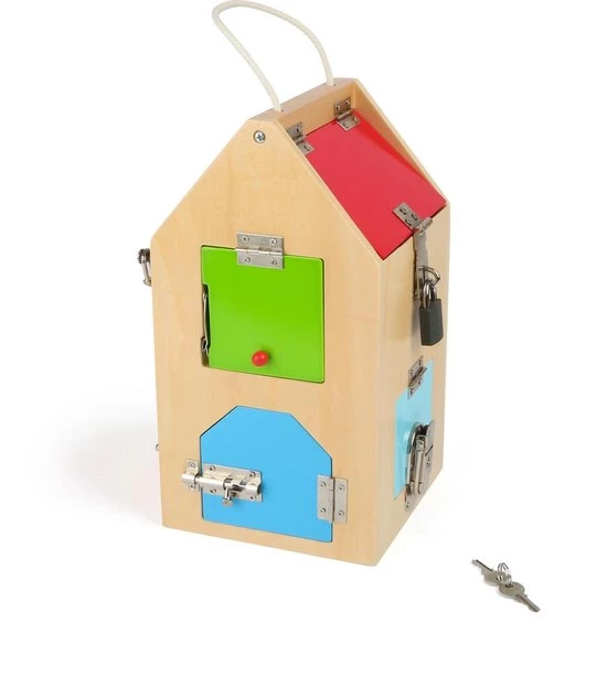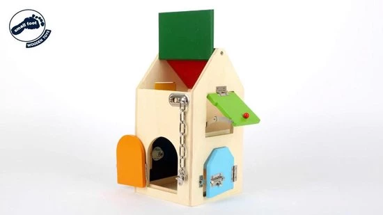 Houten huis met diverse grendels en hendels, veiligheidsketting, beugel- & cilinderslot. Met dit huis worden de alledaagse motorische vaardigheden getraind! Maar wees voorzichtig! ? hier worden de lieve kleintjes grote uitbrekers!