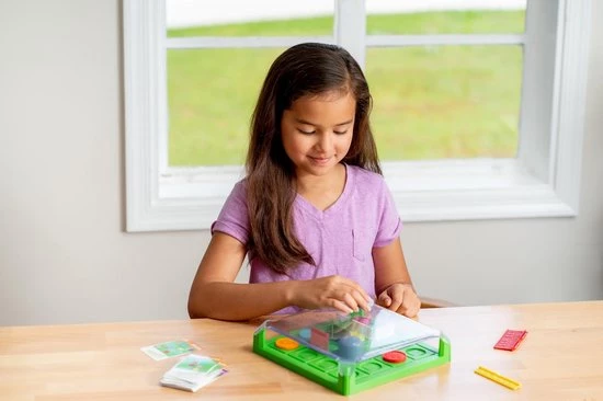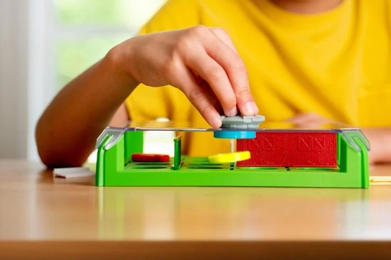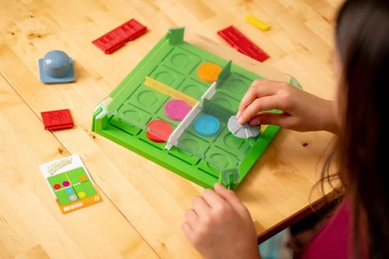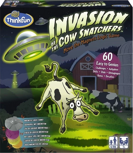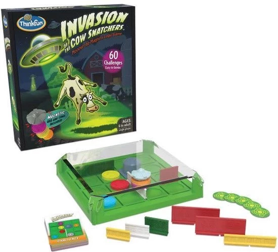 1 spelbord en afdekplaat, 60 uitdagingen met oplossingen, 6 magnetische schijfjes, 9 muren, 1 silo, 5 graancirkels en handleiding Thinkfun Invasion of the Cow Snatchers