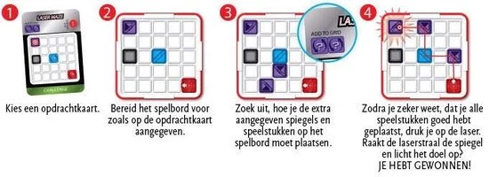 | Verpakkingsinhoud | 60, opdrachtkaarten, met, oplossingen, (4, spelniveaus, van, beginner, tot, expert), spelregels, speelstukken, (1, laser, 5, doelen, met, spiegel, 2, lasersplitsers, 1, dubbelzijdige, spiegel, 1, controlepunt, 1, blokkeerpunt), en, eenspelrooster., Batterijen, inbegrepen. |